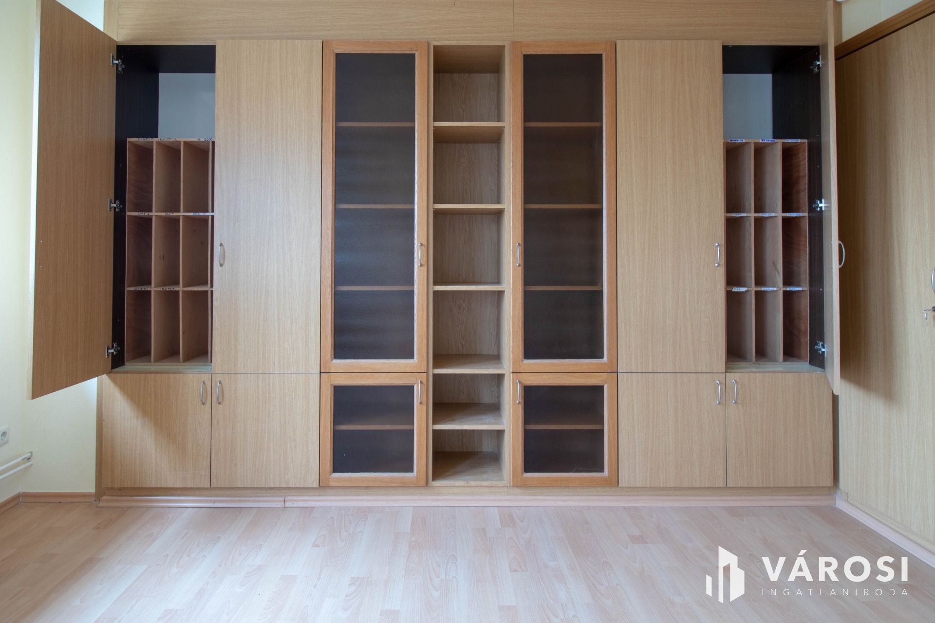 A helyiség egyik végét egy közel 4 m széles, 42 cm mély beépített szekrény zárja, illetve van még a helyiségben egy 230 cm széles, 37 cm mély szekrény, páncélszekrénnyel egybeépítve, valamint egy kisebb, 110 cm széles szekrény is.