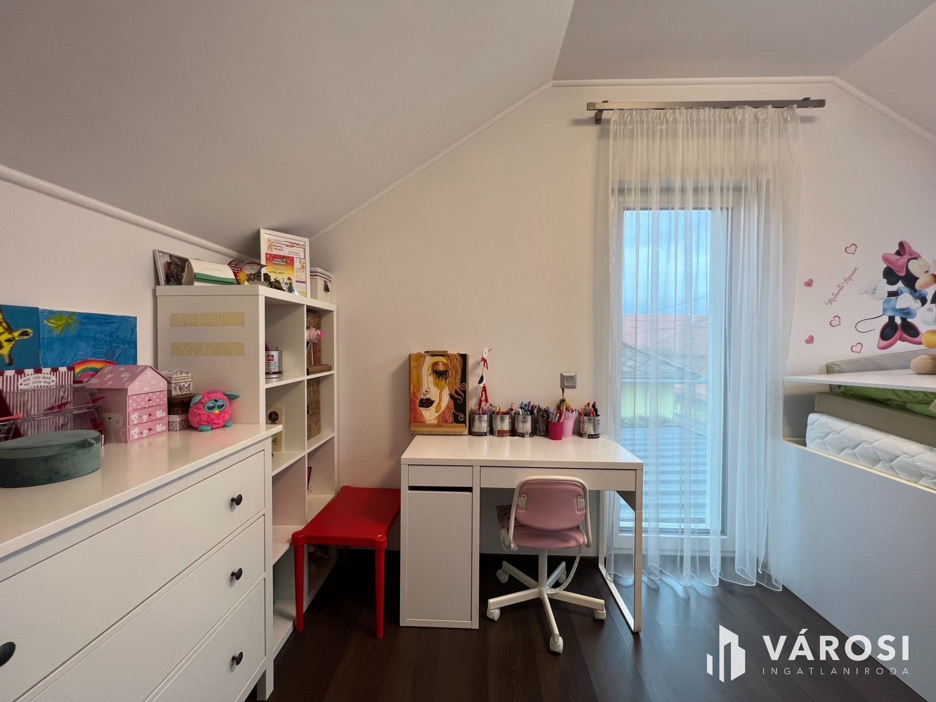 Az emeleten 2 szoba, az egyik francia erkéllyel, fürdőszoba tusolóval, wc-vel, közlekedő, kapott helyet.
