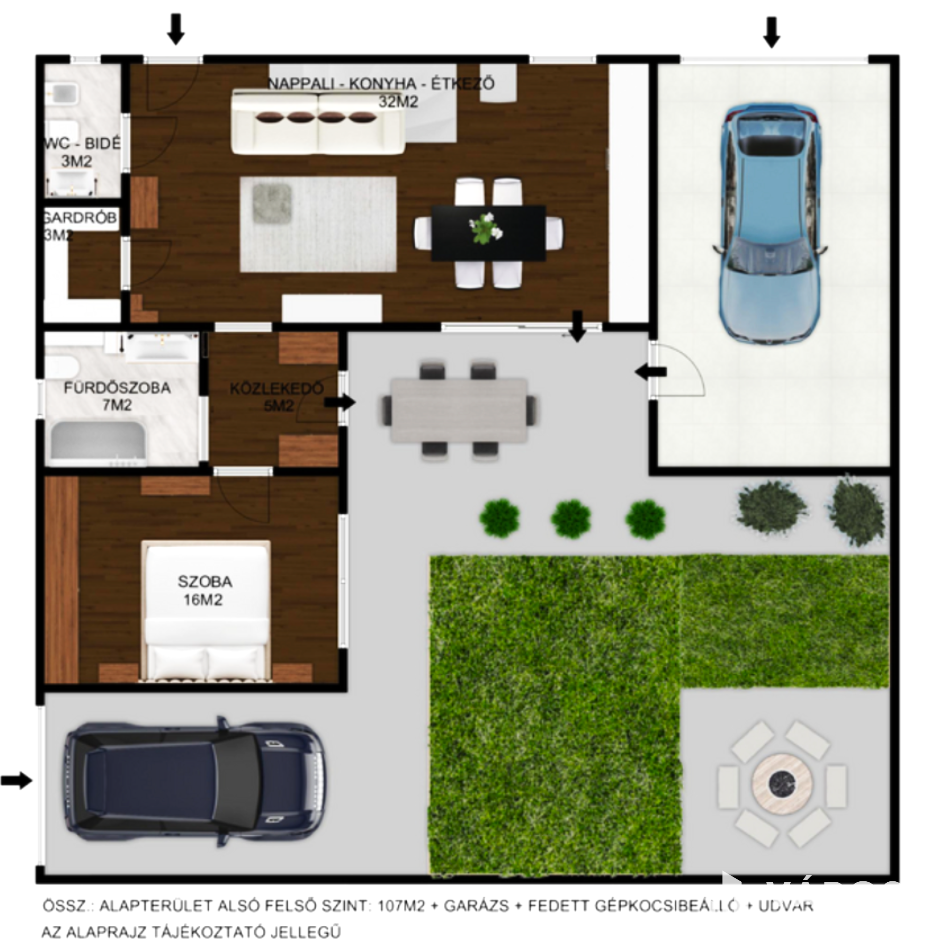 Az udvaron található még egy fedett gépkocsibeálló, és a bejárat, a salgó polcokkal beépített, elektromos garázskapuval felszerelt kényelmes garázsba.