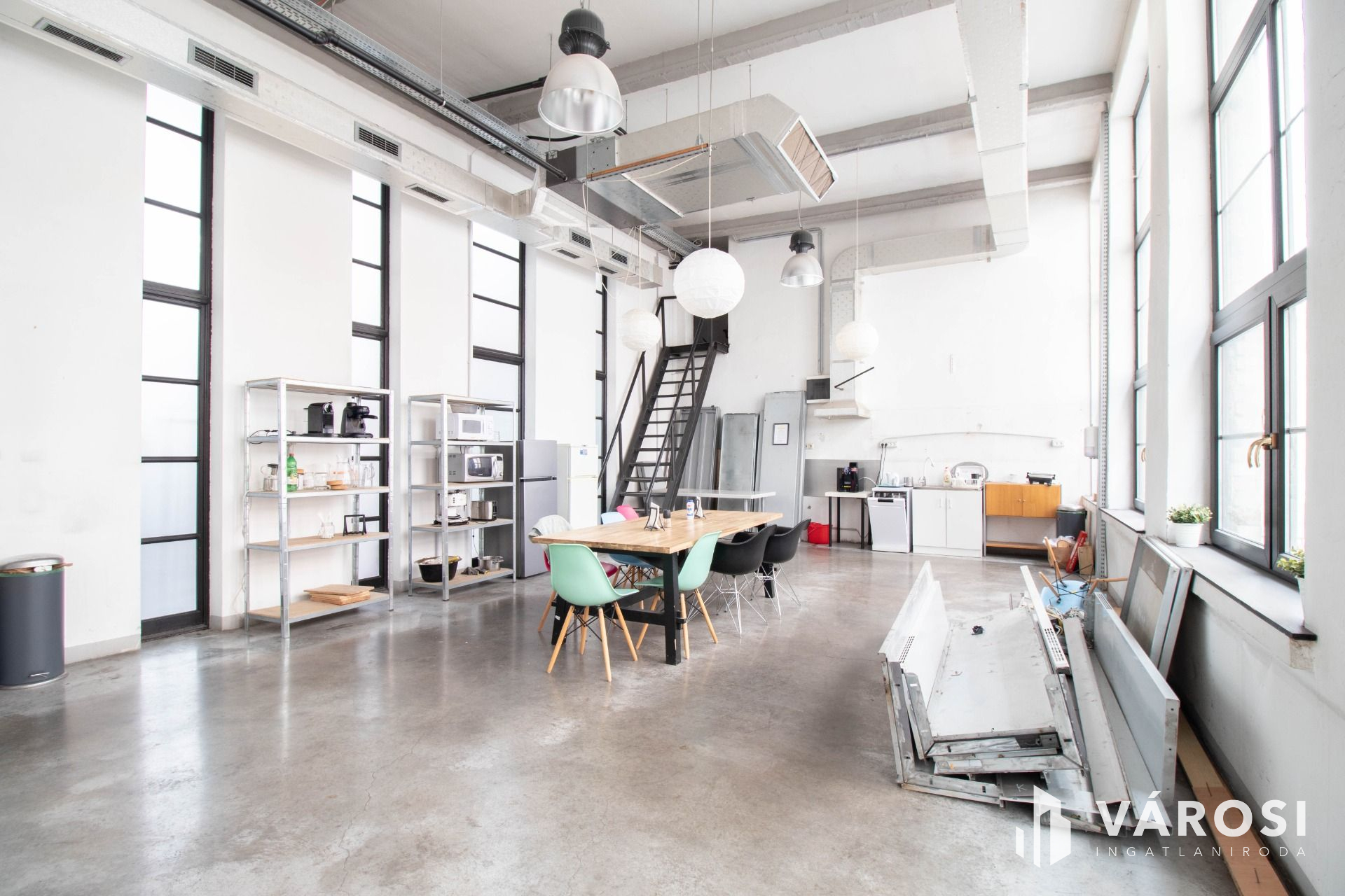 A felvonóból közvetlenül a 282 m2-es és közel 8 m-es belmagasságú hatalmas fogadó térbe jutunk, mely közösségi térnek vagy munkahelyek kialakításával közös irodának egyaránt megfelel.