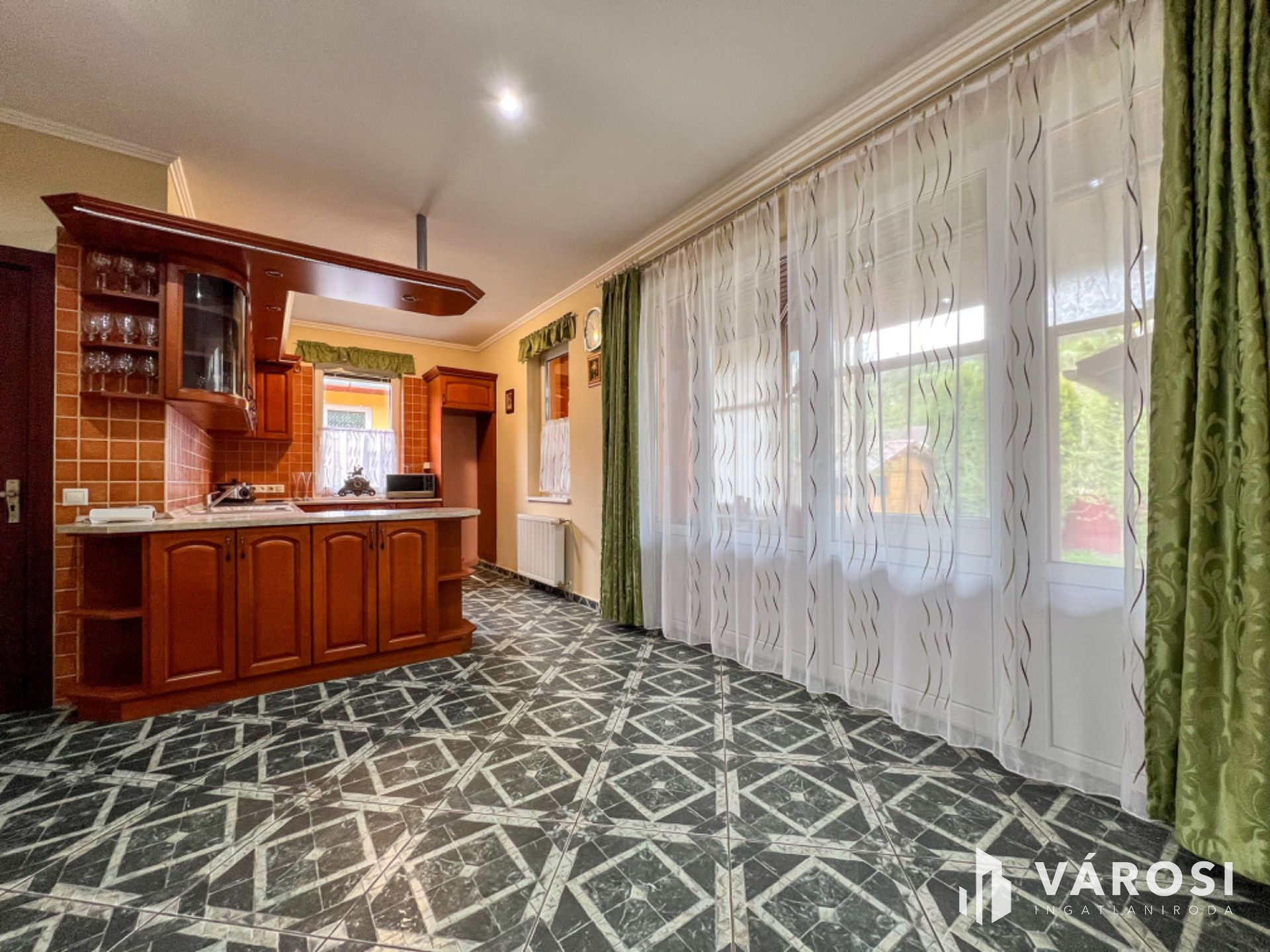 Helyiségei: 2 hálószoba, nappali, konyha+étkező, kamra, közlekedő, gardrób, mosóhelyiség, fürdőszoba, szauna, külön nyíló W.C., szélfogó, garázs, beépített terasz, nyitott terasz.