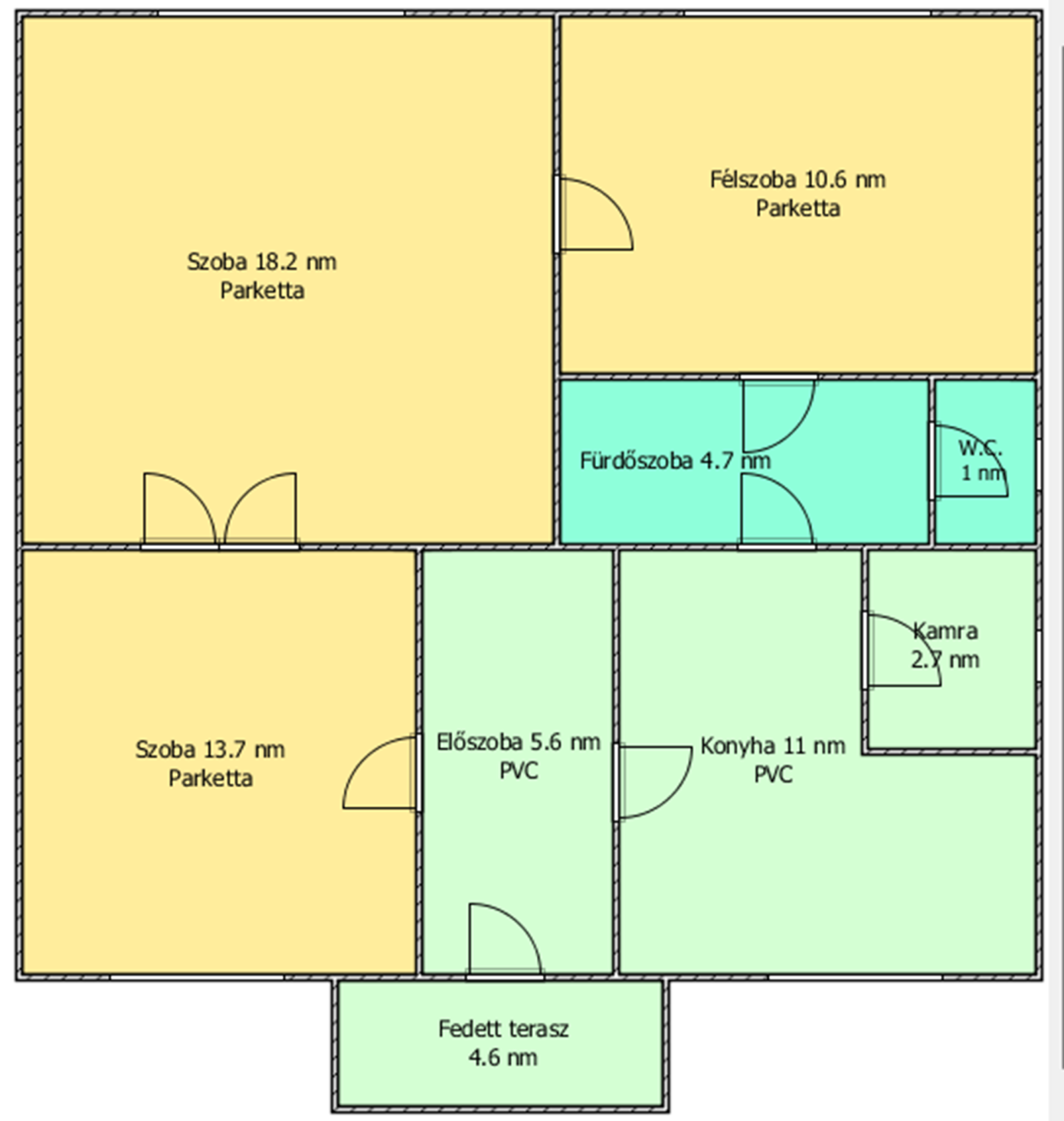 Helyiségei: 2 szoba, 1 félszoba, előszoba, fürdőszoba, külön nyíló W.C., konyha, kamra, fedett terasz.