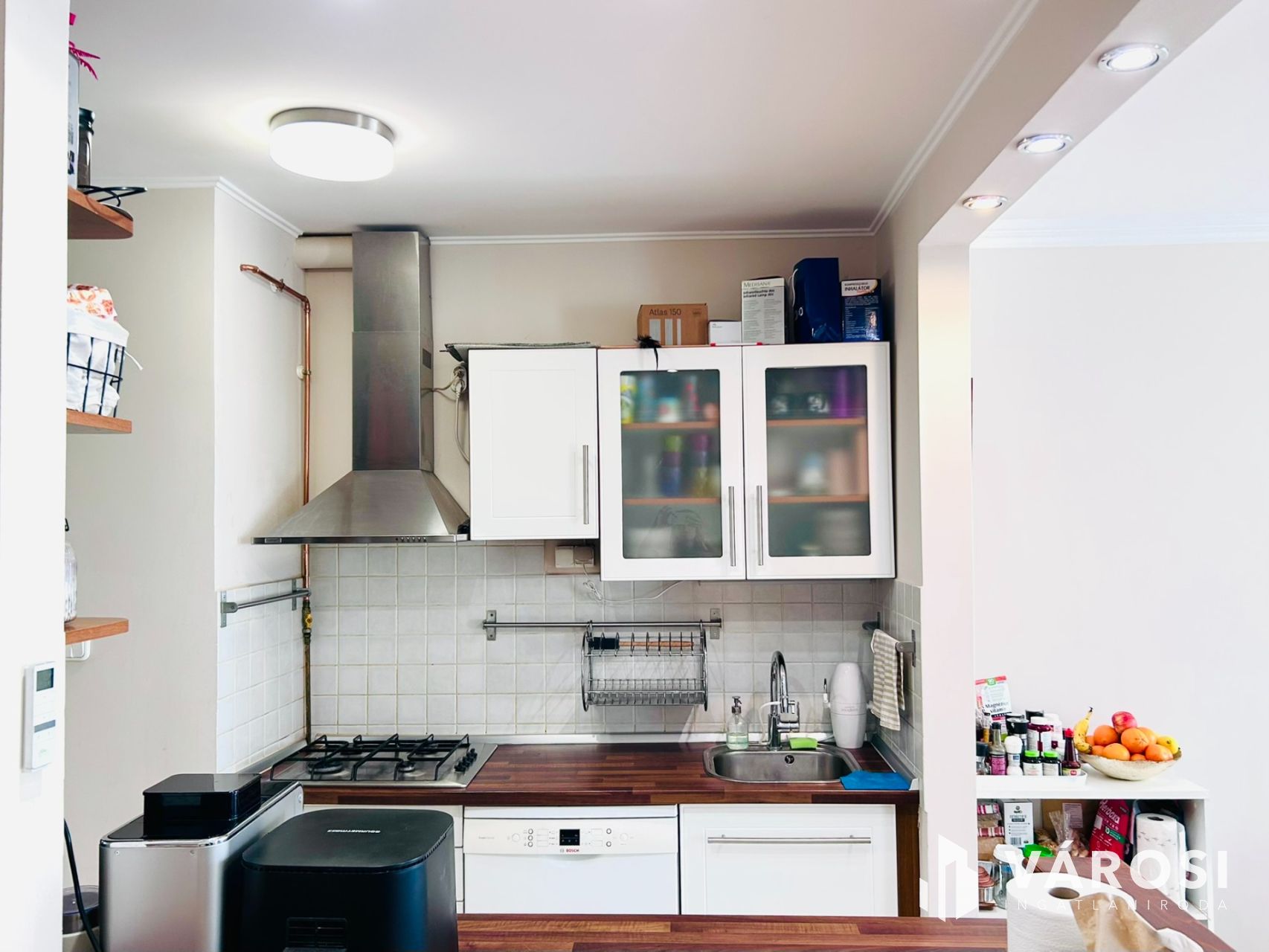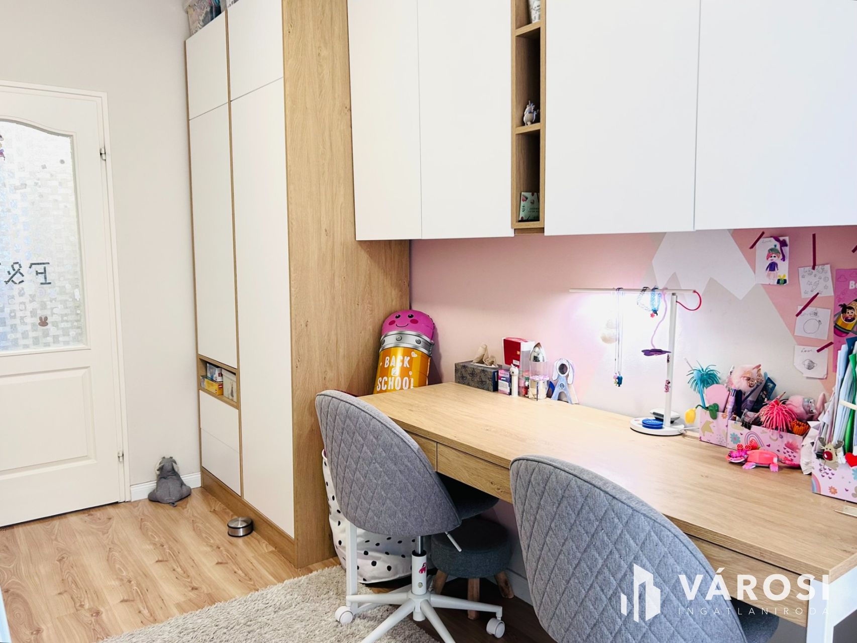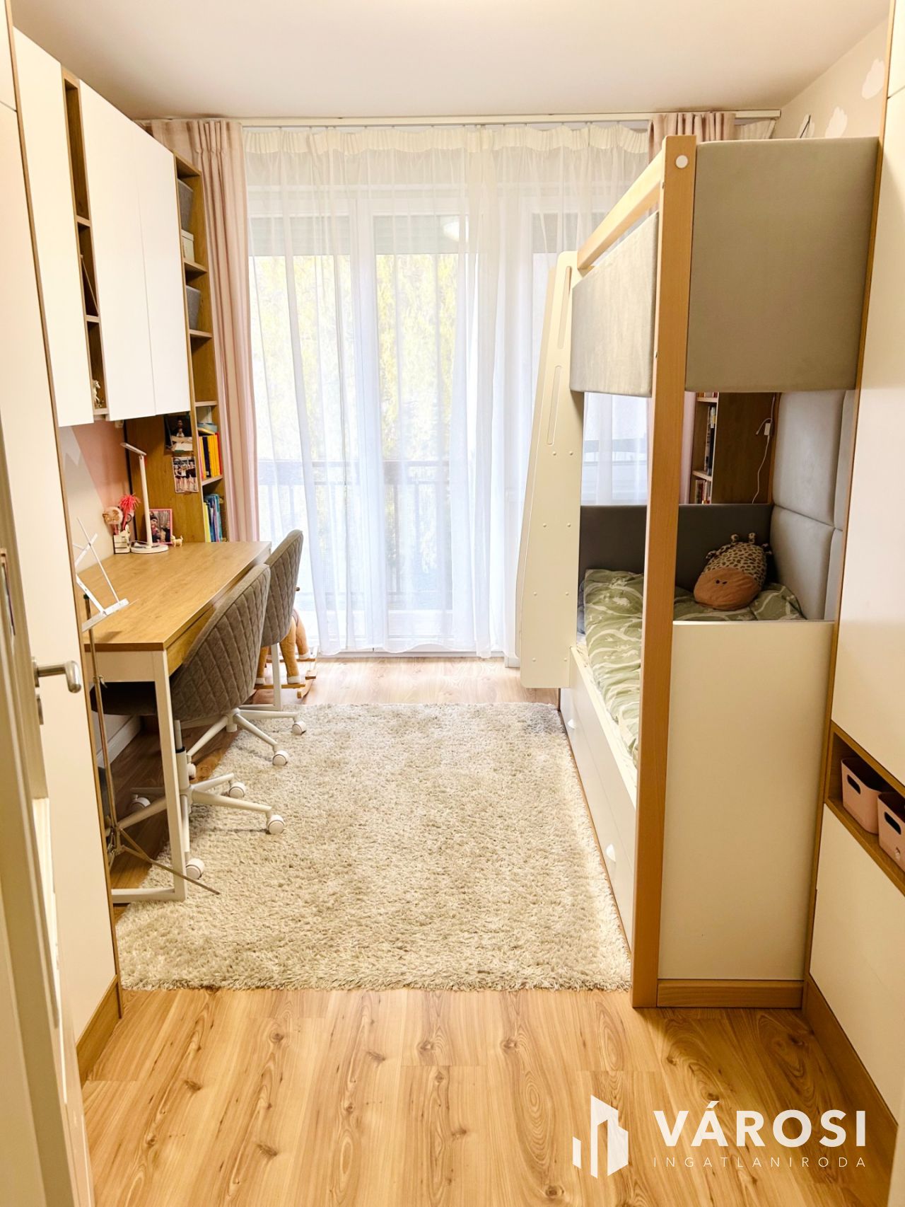 - Beépített szekrények segítik a rendszerezett tárolást.