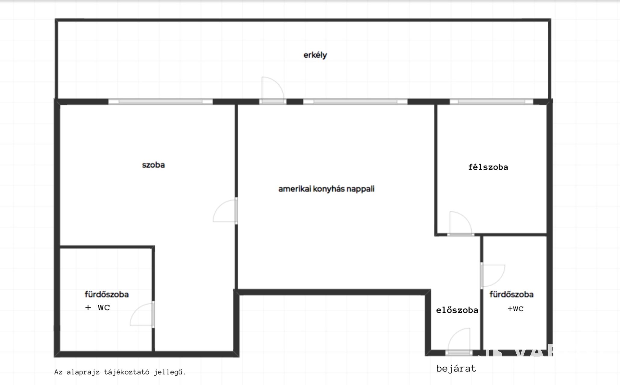 - Elrendezés: Amerikai konyhás nappali, szoba, félszoba, 2 fürdő wc-vel, előszoba, fedett erkély