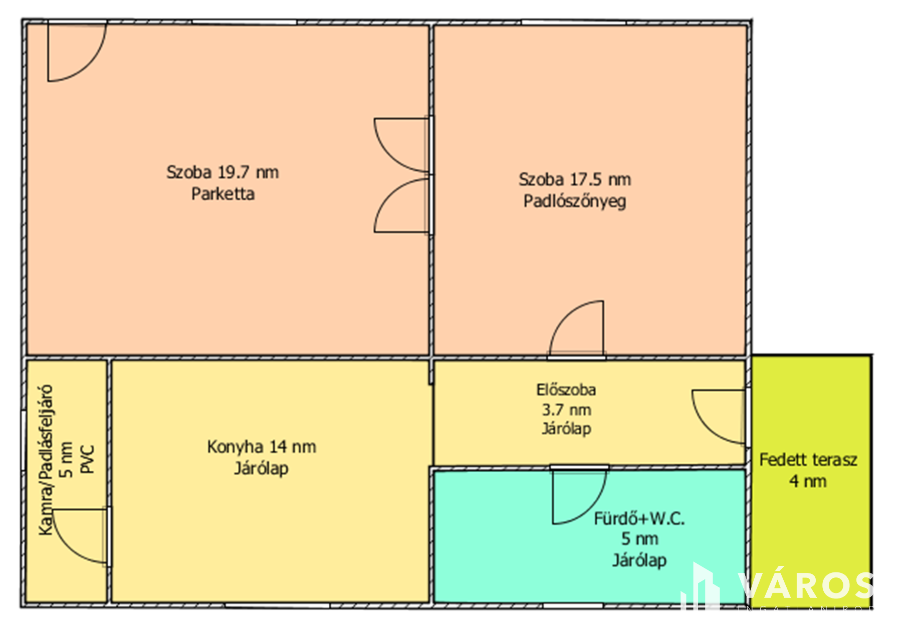 Helyiségei: 2 szoba, előszoba, fürdőszoba, konyha, kamra/padlásfeljáró, az alsó szinten 10 nm-es pince.