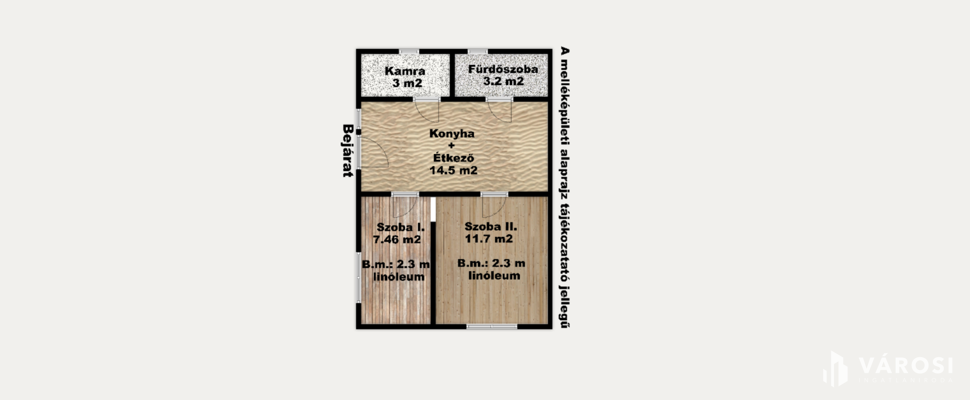 Az ingatlanon található egy szintén téglából épült, teljes közművel ellátott, 40 m²-es melléképület, amely vendégházként, külön lakrészként vagy akár vállalkozási célra is kiválóan hasznosítható. Az épületben 2 szoba, 1 konyha étkezővel, 1 fürdőszoba WC-vel és 1 kamra került kialakításra.