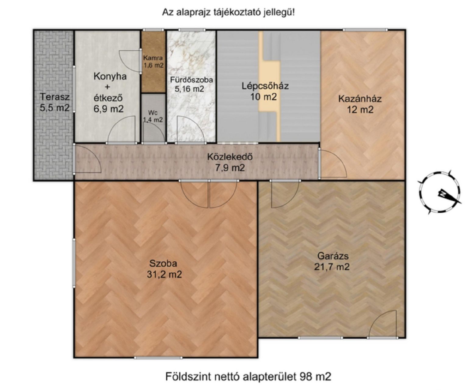 A szobák parkettával burkoltak, a vizes helyiségek csempézettek - kerámia járólappal ellátottak.