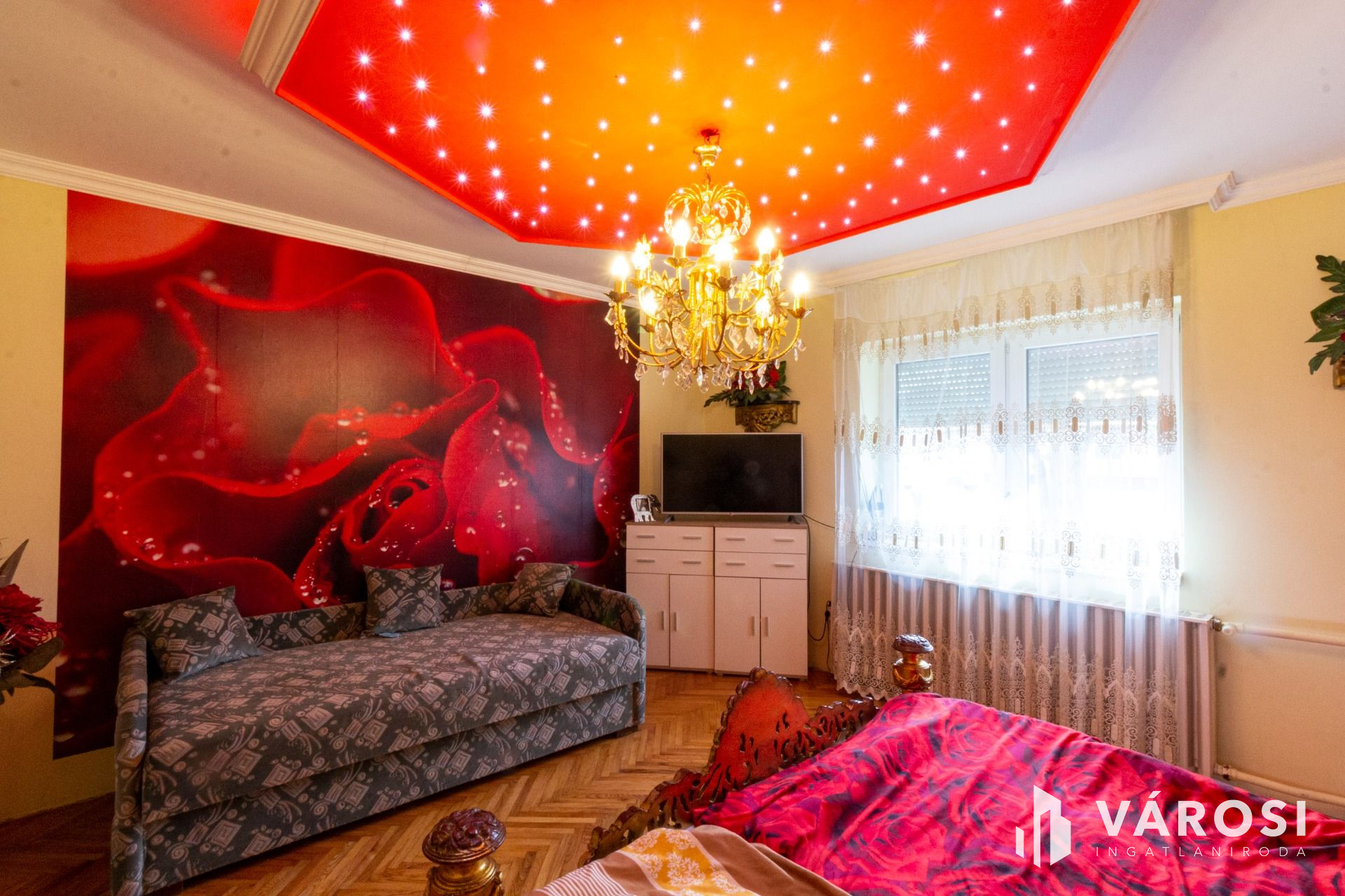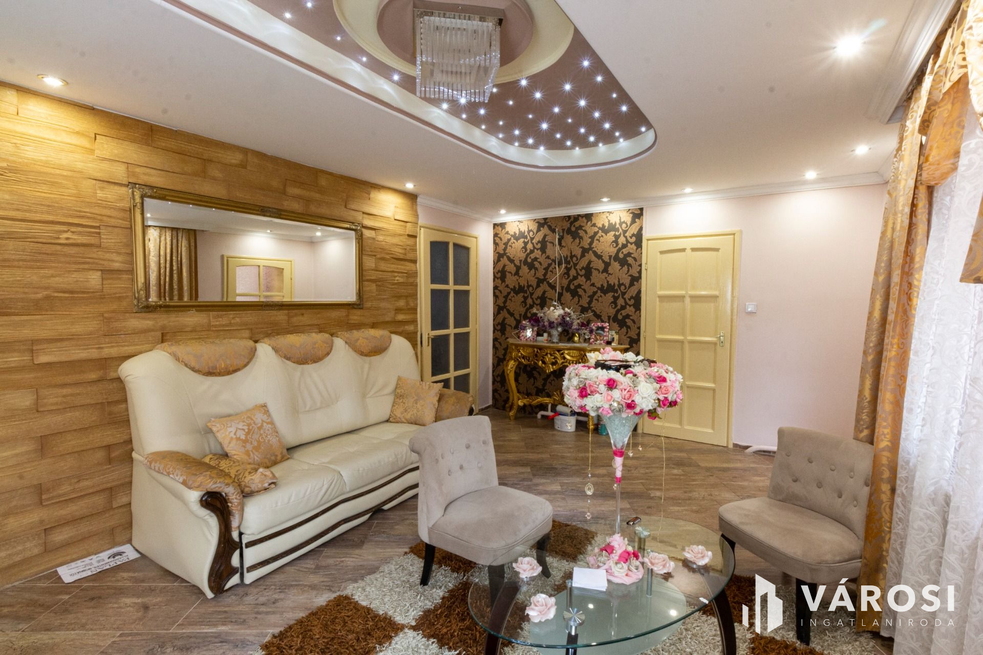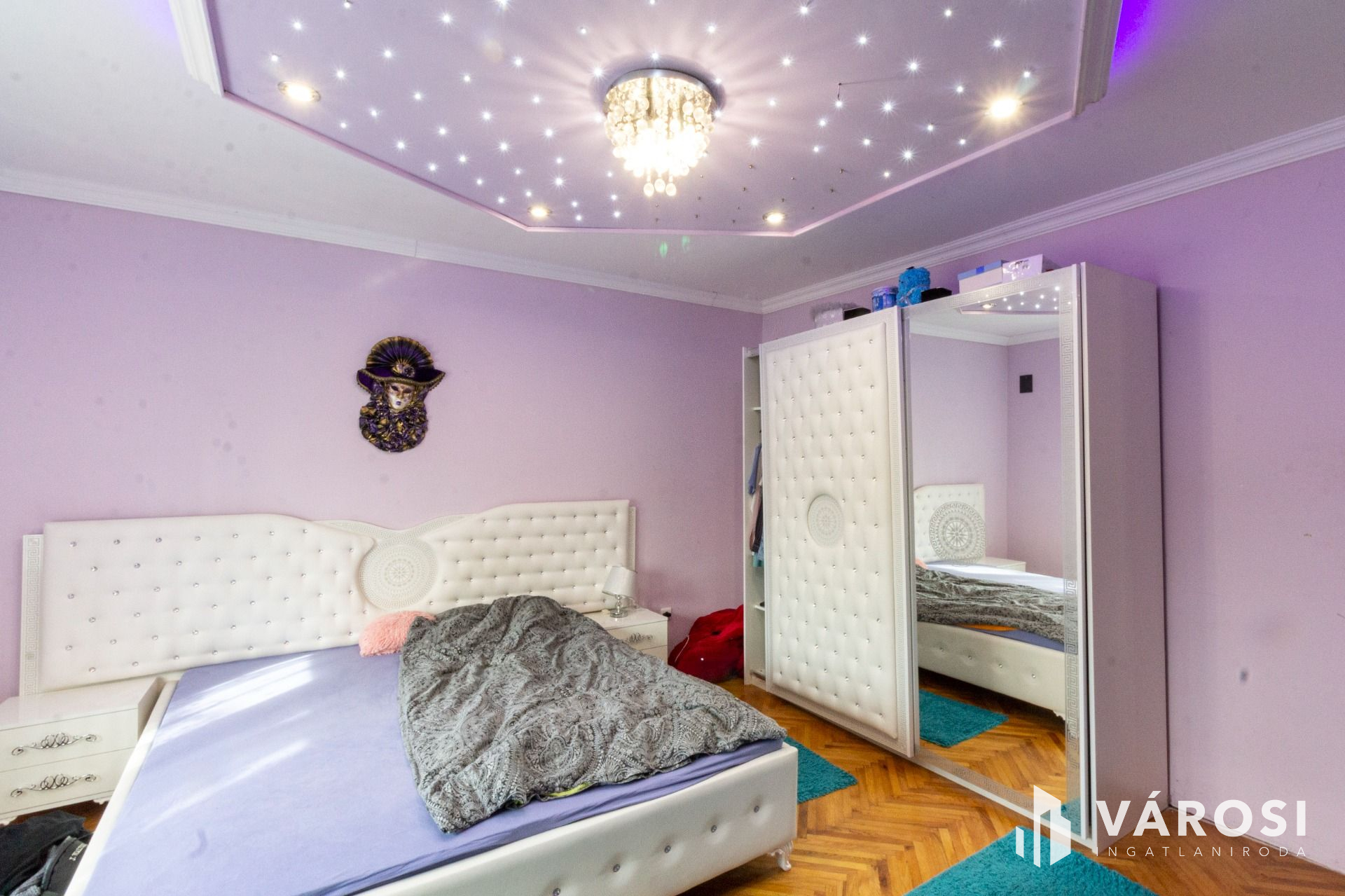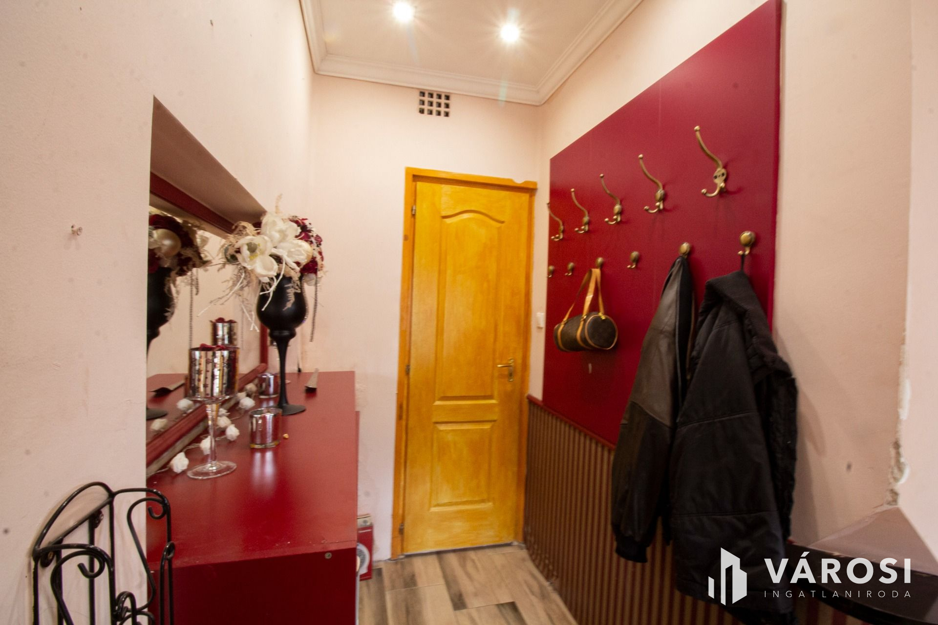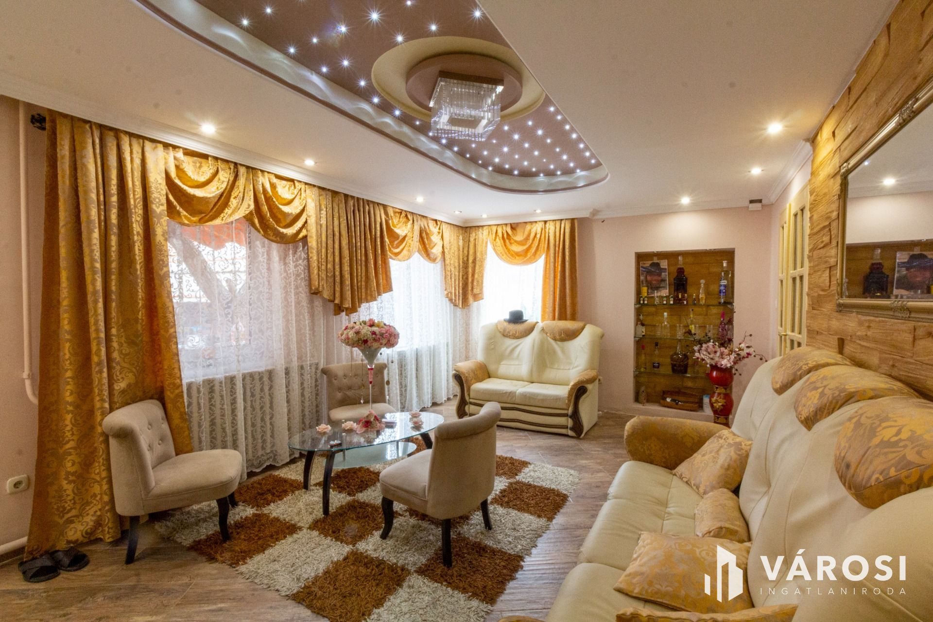 A lakásba belépve jobbra az amerikai konyhás étkező, balra pedig a nappali található, amelyből további két szoba nyílik. A szobák parkettások, a többi helyiség hidegburkolatú. Az L alakú ingatlan hátsó részében, külön bejáratú apartman lett kialakítva. Albérletnek kiadható lakrész.