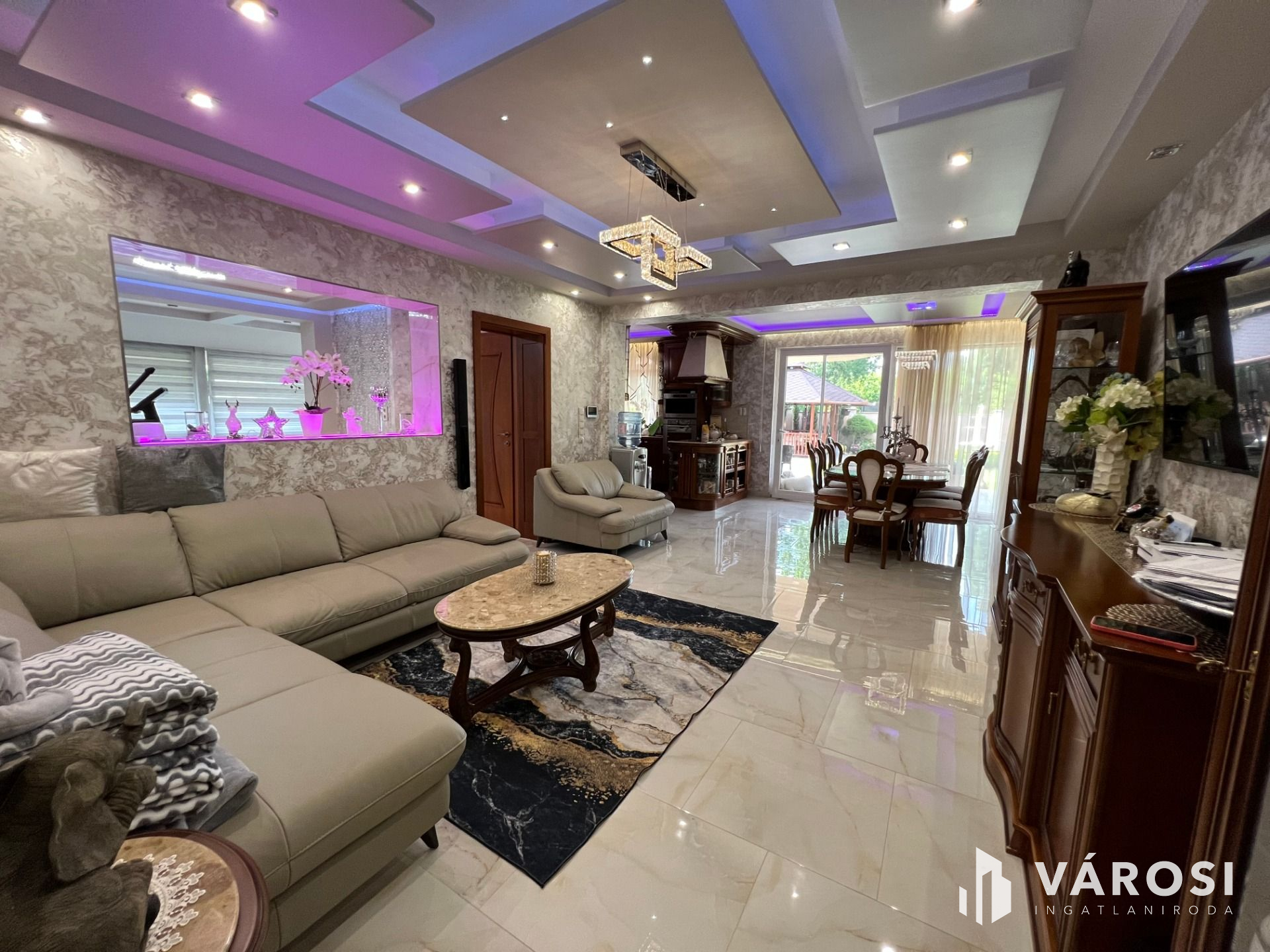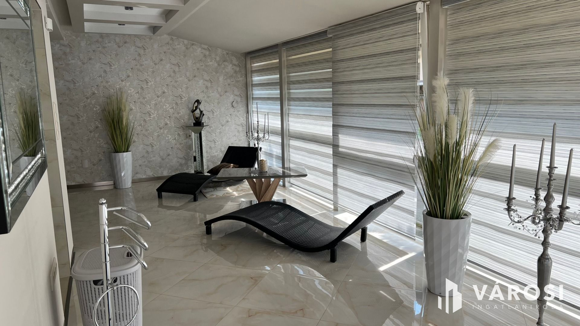 A 332 square meters independent luxury property for sale in Liget residential park, a prominent part of Debrecen. The lower level of the house has a living room, dining room, kitchen, an entrance hall, and a toilet. Naturally, there is also a large double garage and a terrace on the ground floor. On the upper level, there is a large space from which you can reach the three bedrooms and the two large bathrooms. The upper level also has a wardrobe, laundry and kitchen, and each bedroom has a terrace. The lot is large, 760 square meters, plus another lot of similar size is fenced off at the back. The garden is beautifully landscaped, and there is also a beautiful terrace equipped with everything. A heated swimming pool in front of the terrace provides residents with a pleasant feeling of luxury at home. The house has a high technical content and is equipped with all extras, fully furnished. Located in the most elite part of Debrecen, surrounded by high-end, beautiful properties.