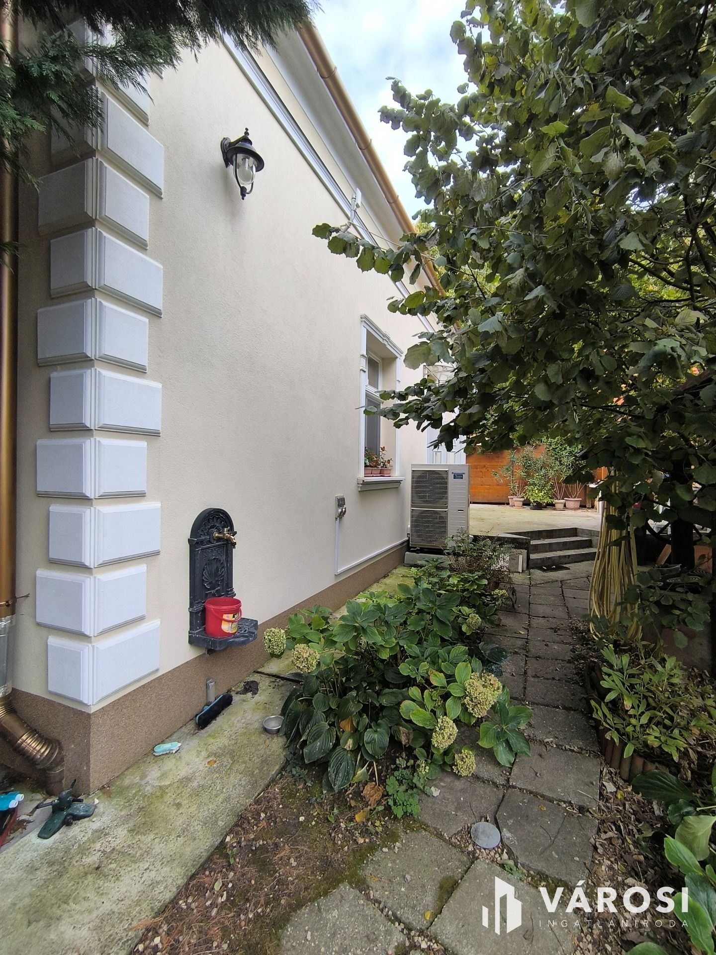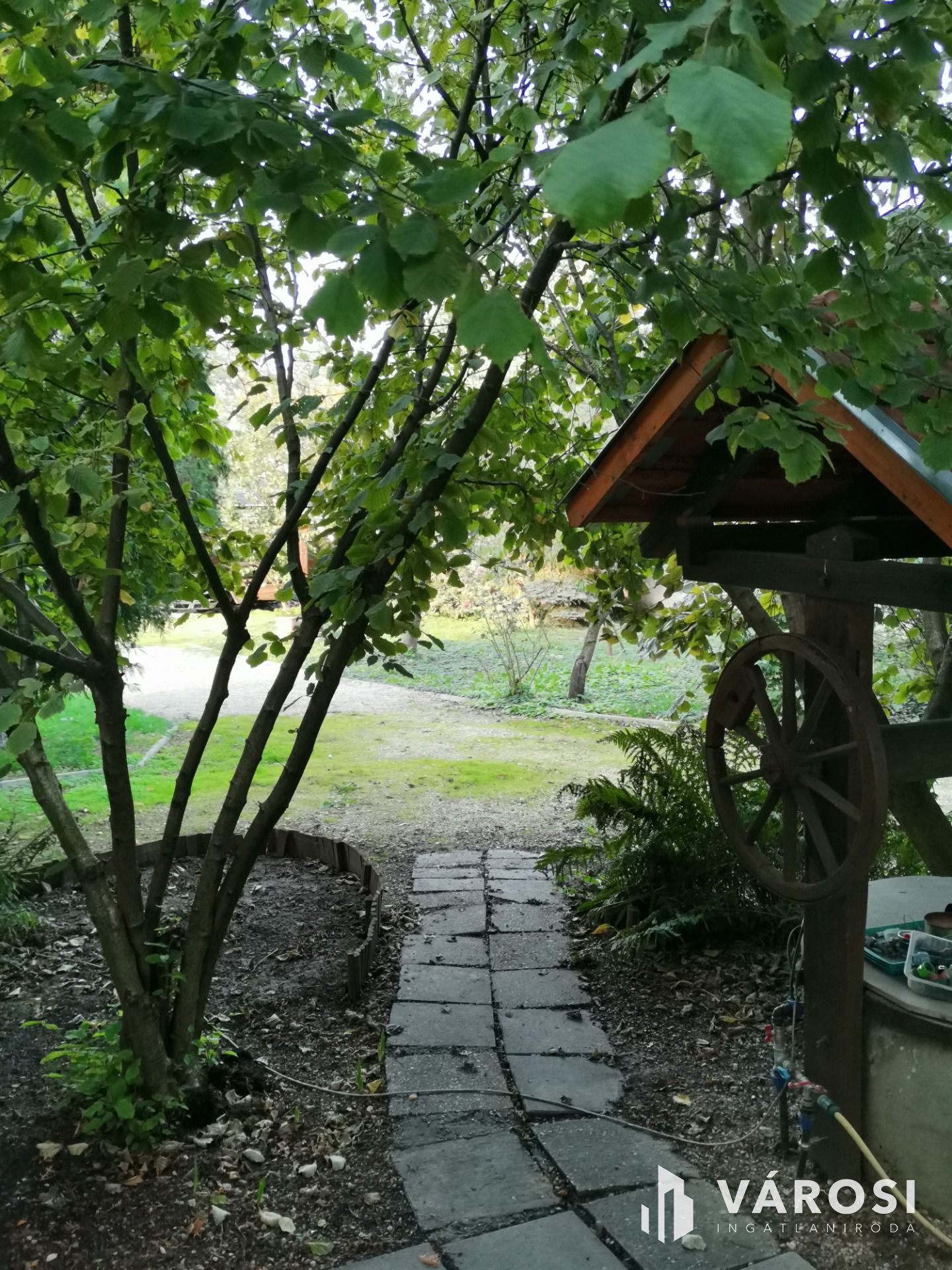 Parkosított, romantikus kert veszi körül a házat. A ház mögött félig fedett terasz, garázs és hátul egy 3 autó számára alkalmas fedett beálló is van.