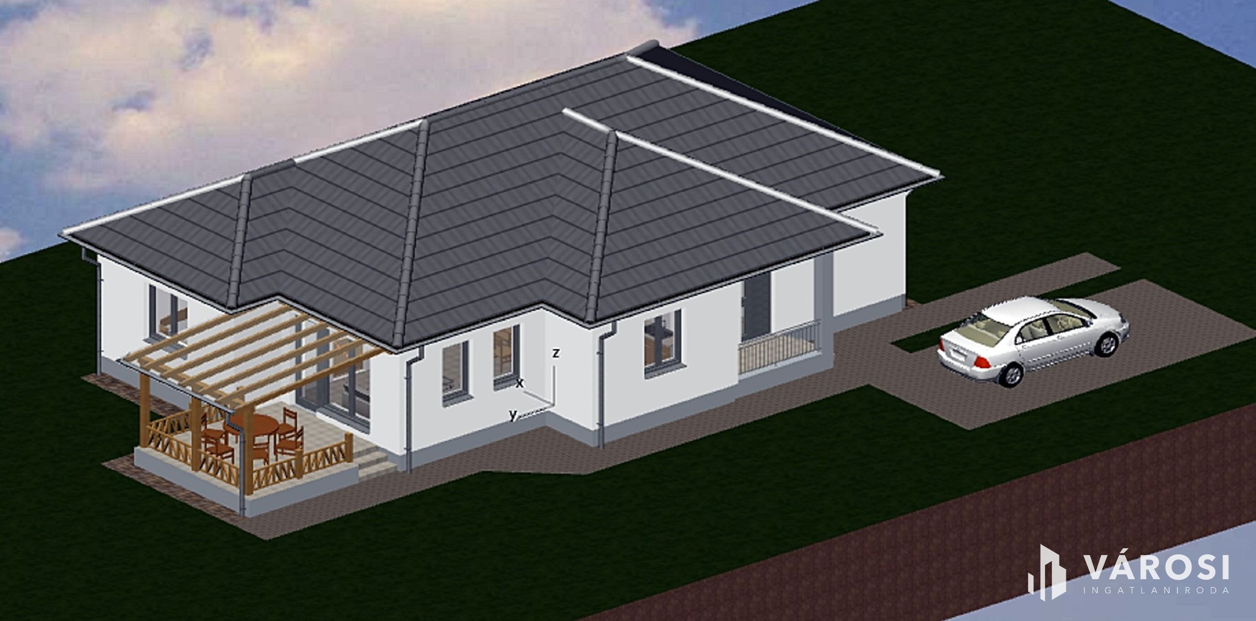 A ház kialakítása átgondolt és élhető: világos nappali kapcsolódik a konyha-étkezőhöz, három külön nyíló szoba, két fürdőszoba, gardrób, kamra és mosókonyha szolgálja a kényelmet, míg a fedett terasz tökéletes helyszíne lehet a pihenésnek vagy baráti összejöveteleknek. Az egyszintes kialakítás minden korosztály számára praktikus és időtálló megoldás.
