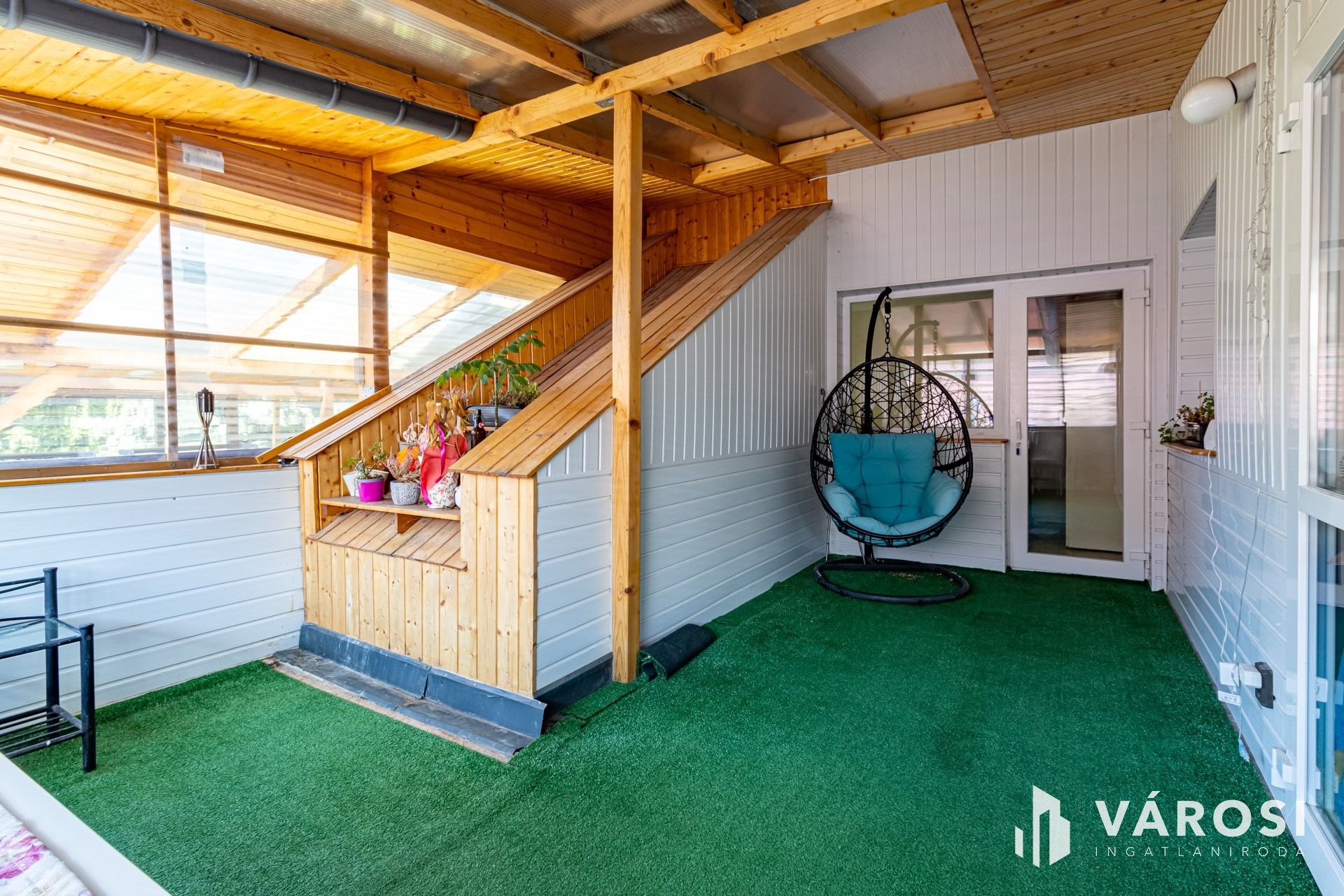 A ház egy 957 m²-es telken helyezkedik el, amely ideális méretű: könnyen karbantartható, mégis élhető kert. A telek hátsó részén egy kis patak csörgedezik.