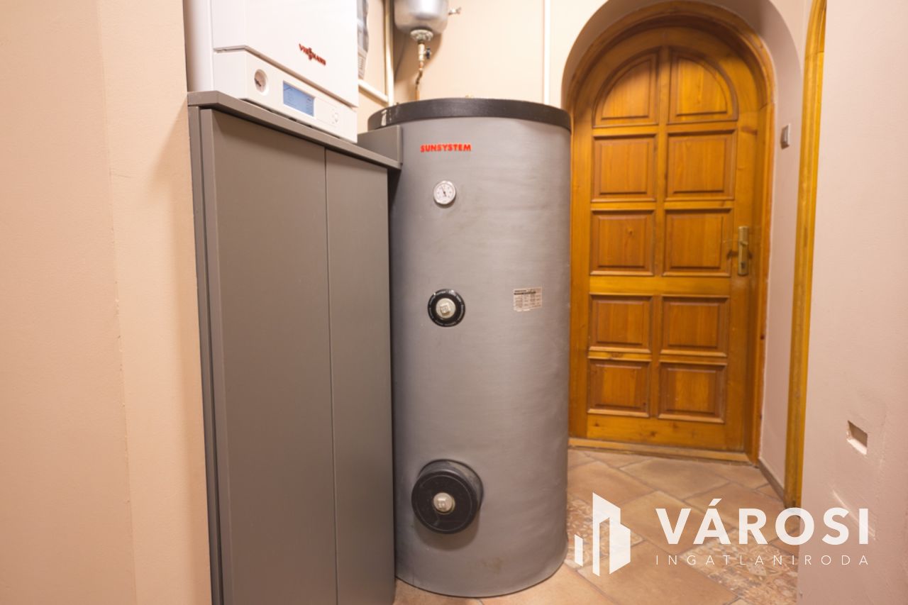 A házban gázfűtés + padlófűtés található, így télen is kellemes meleg otthon fogadja, míg a forró nyári napokon a hűvös levegőről klíma gondoskodik. A vastag, téglafalazatnak köszönhetően egyébként nyáron is kellemes a belső hőérzet.