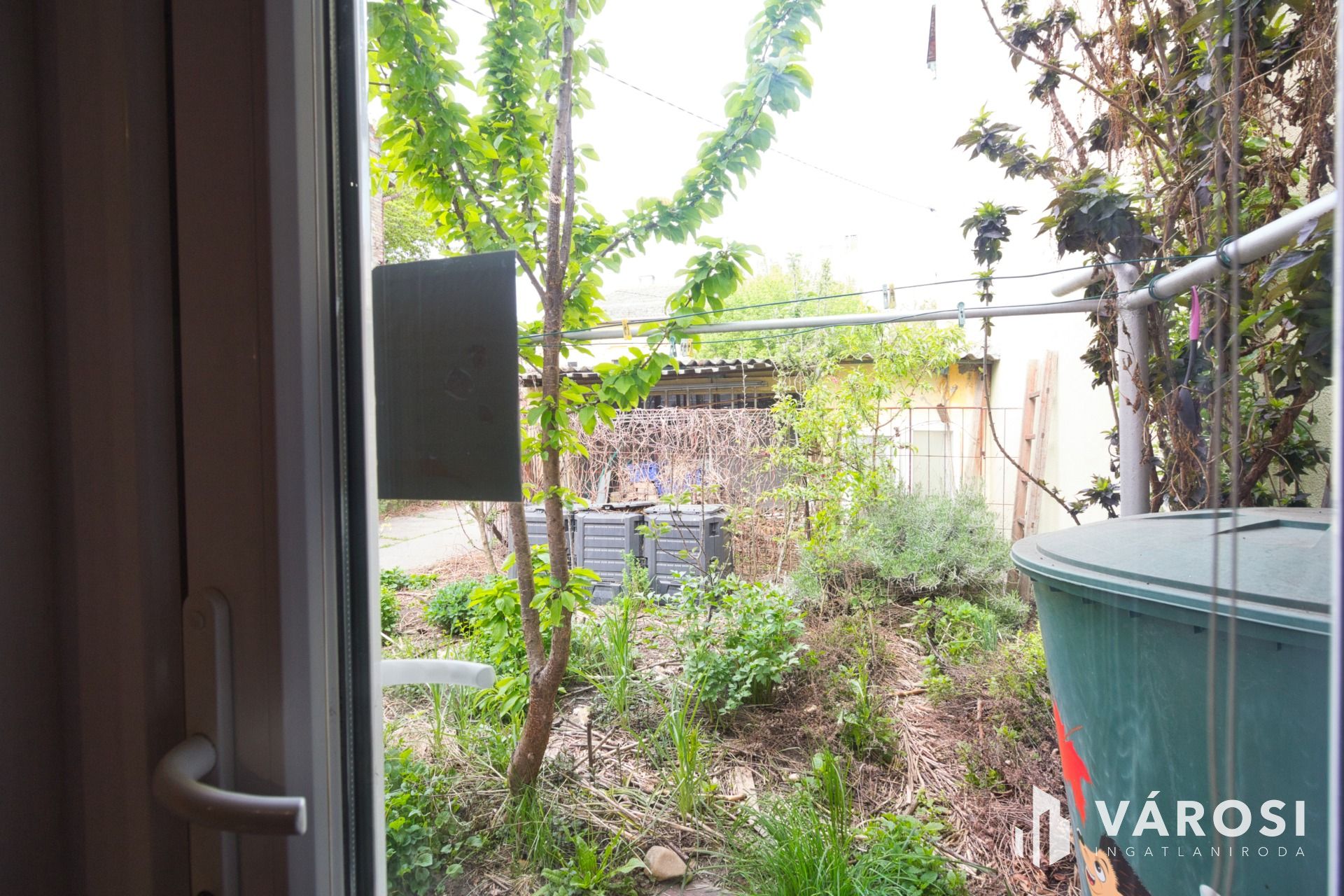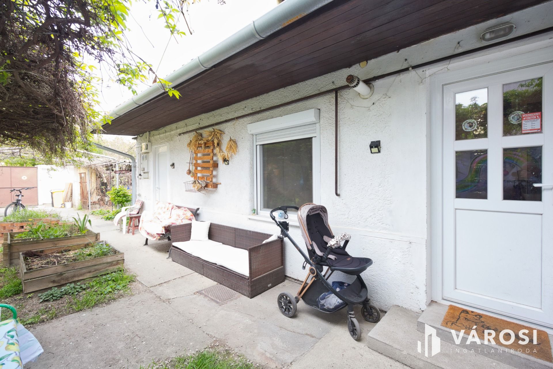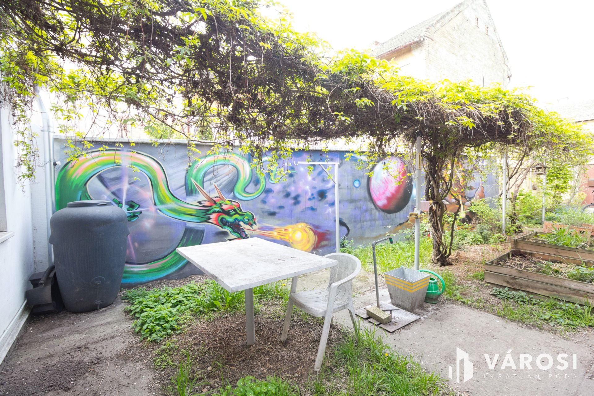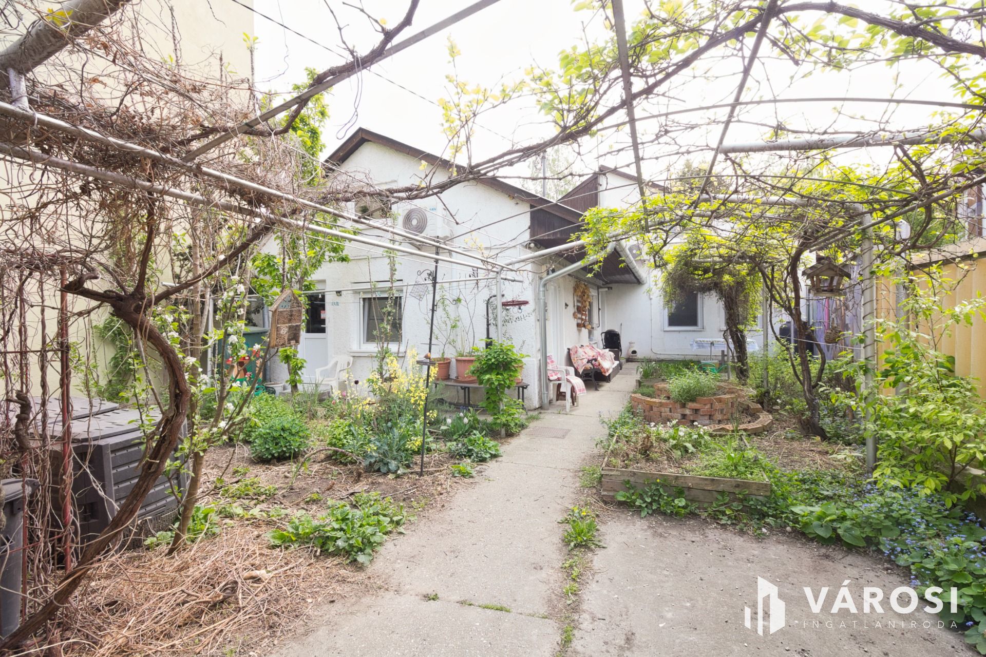 A kertben nagyon szép lugas lett szőlőből kialakítva, de 1-2 tő paradicsomnak, paprikának is marad hely. Az autónak pedig 15 m2-es garázs.