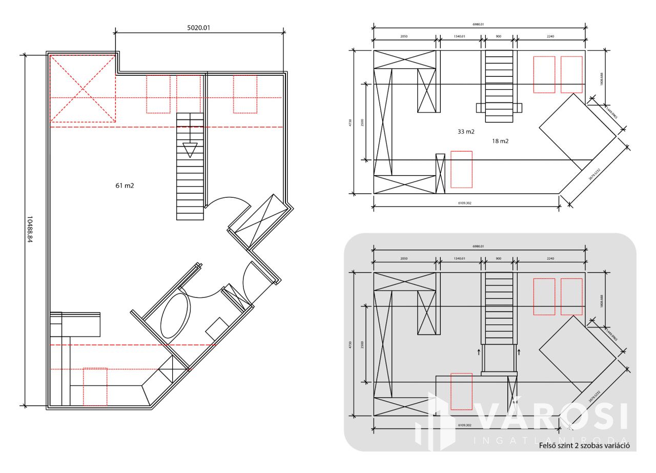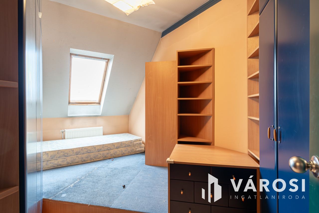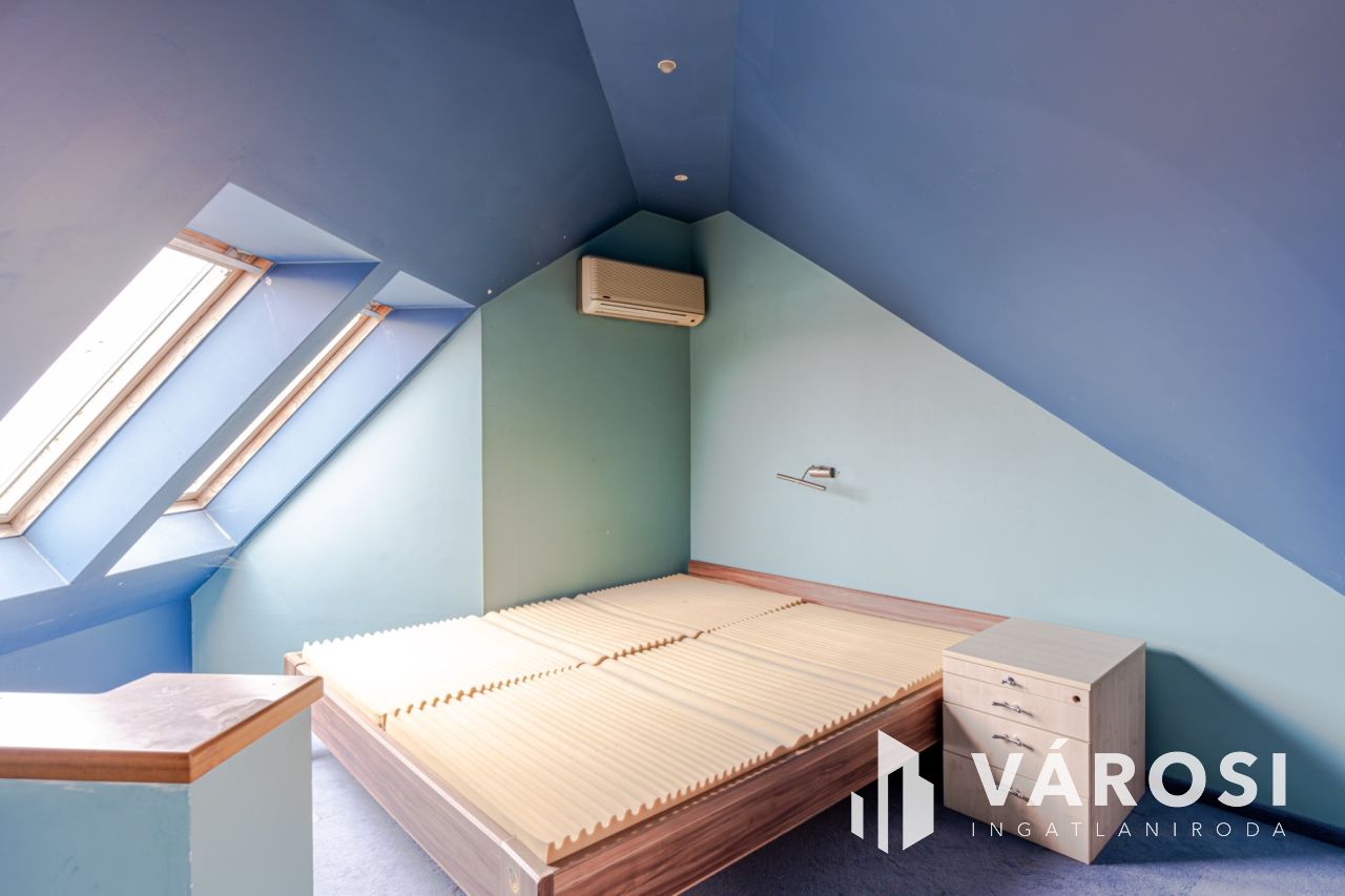 A nappaliból egy kényelmes lépcső vezet fel az emeletre, ahol egy egybenyitott, sokoldalúan alakítható tér található. Jelenleg egy hálórész, dolgozósarok és gardrób kapott itt helyet, de könnyedén két különálló szobává alakítható - tökéletes gyerekszobának vagy akár egy extra hálónak.