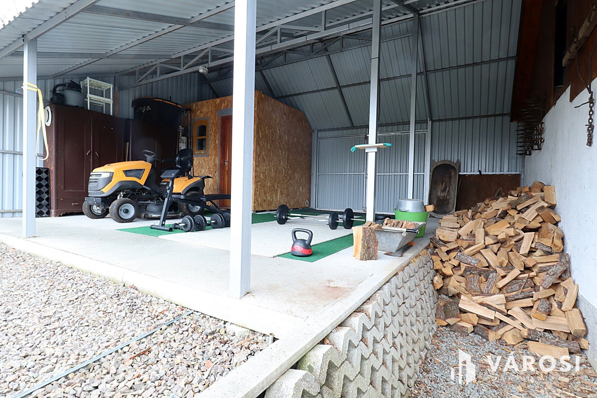 Az udvari gépjárműbeálló mellett egy dupla garázs is helyet kapott, így bőséges parkolási lehetőség áll rendelkezésre. Hobby barkácsoláshoz pedig a tágas műhely is adott. Az ingatlan összközműves, de egy ásott kútra szerelt házi vízmű is szolgáltatja a jó minőségű vizet. A kamera rendszer pedig gondoskodik az ingatlan biztonságáról.
