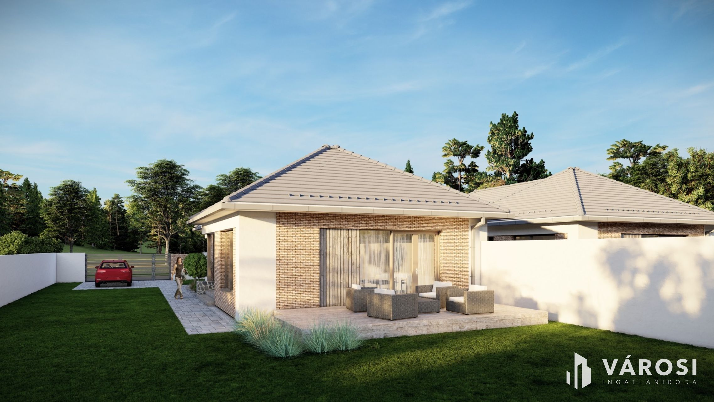 A házban tágas amerikai konyhás nappali + 3 kényelmes szoba, gardrób, valamint külön fürdő és WC kap helyet.