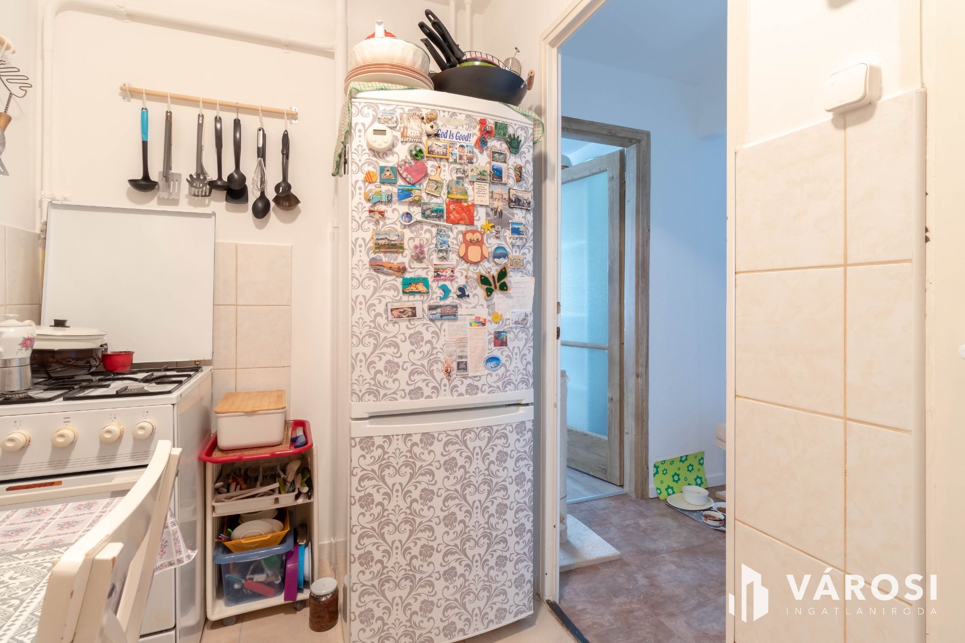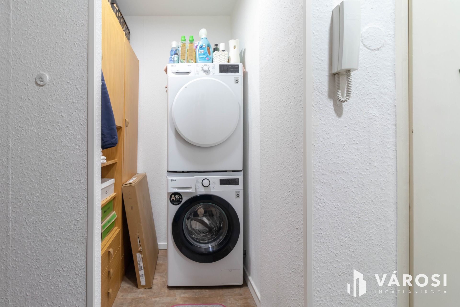 A bejárat melletti gardróbban – ahogy a fotókon látható – mosógéphez, szárítógéphez kialakított vizes csatlakozás érhető el.