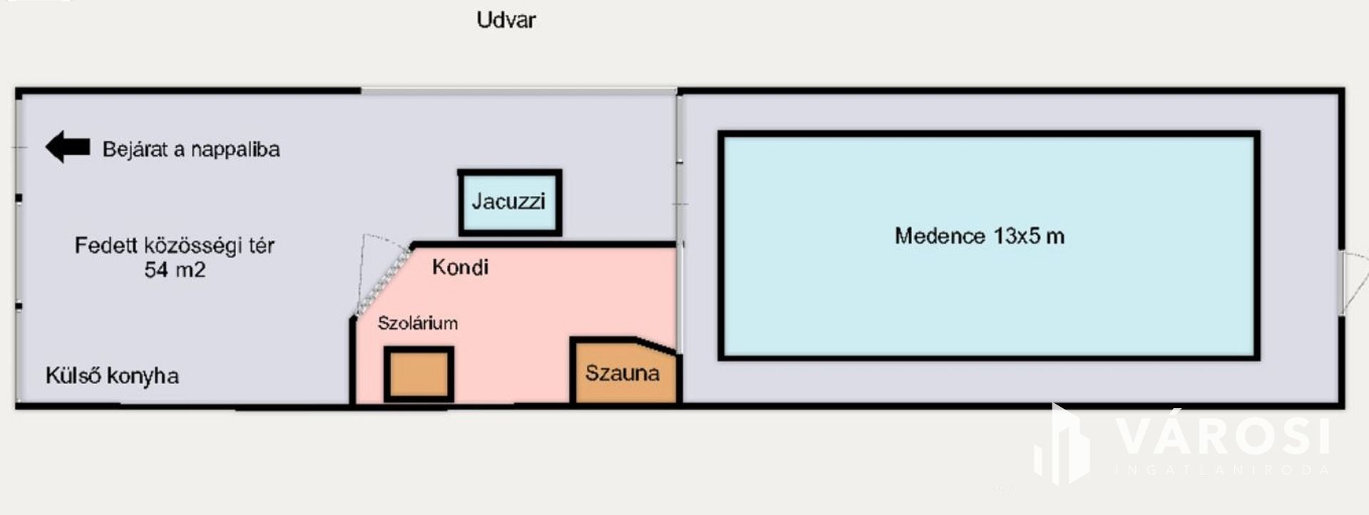 A medence mögött öltöző illetve komplett fürdőszoba és toalett található, ahol mosógép bekötésére is van lehetőség.